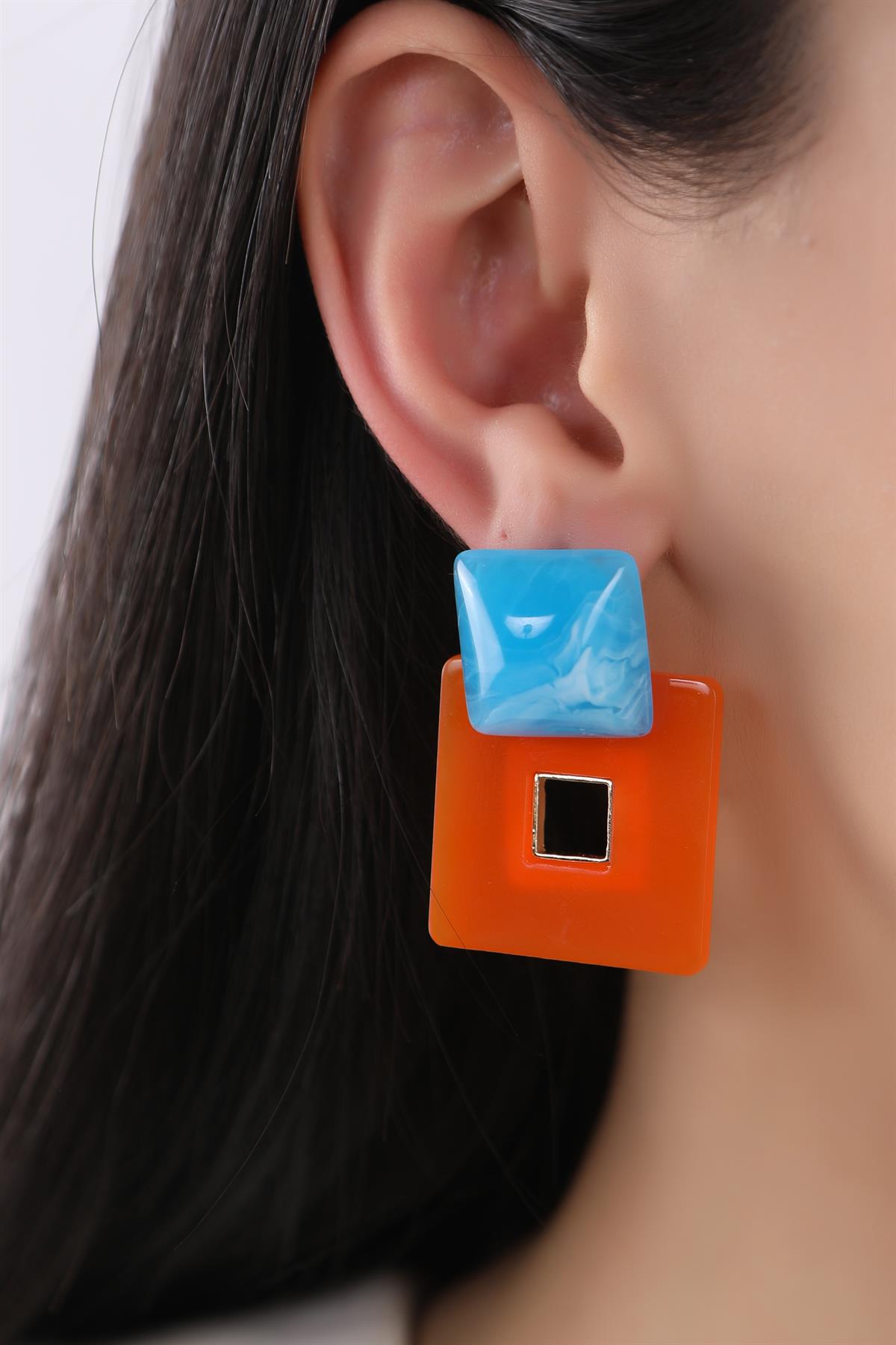 Akrilik Sallantılı Turuncu Mavi Küpe Malzeme: Akrilik, Pirinç Altin Kaplama Ölçüm: 4.3 cm Küpeler hediye kutusu ile gönderilecektir.
