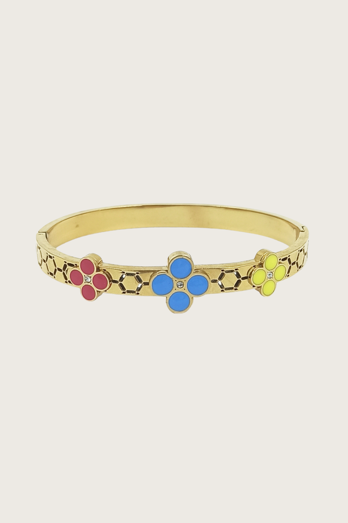Altı Kaplama Renkli Çiçek Detaylı Kelepçe Çelik Bilezik