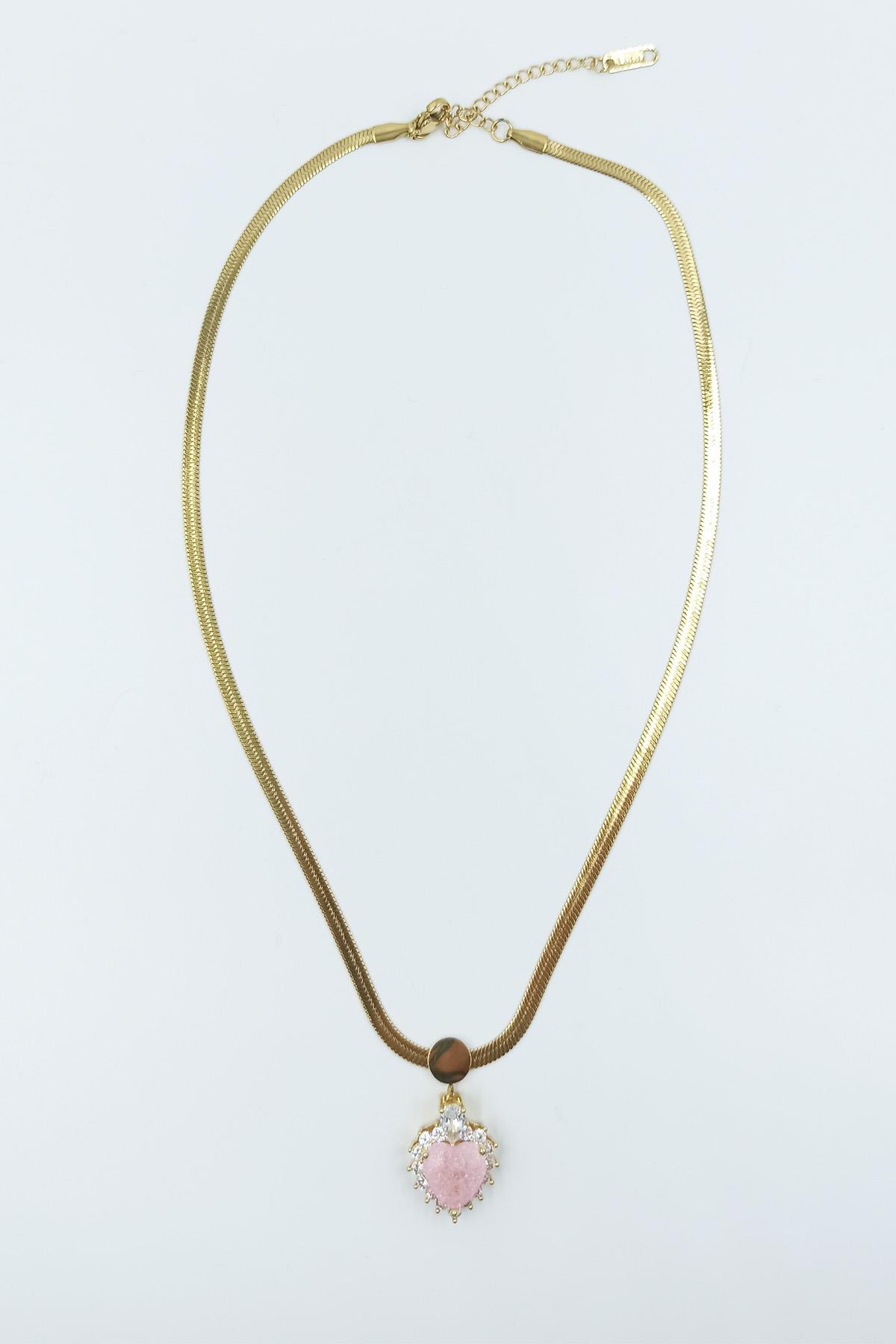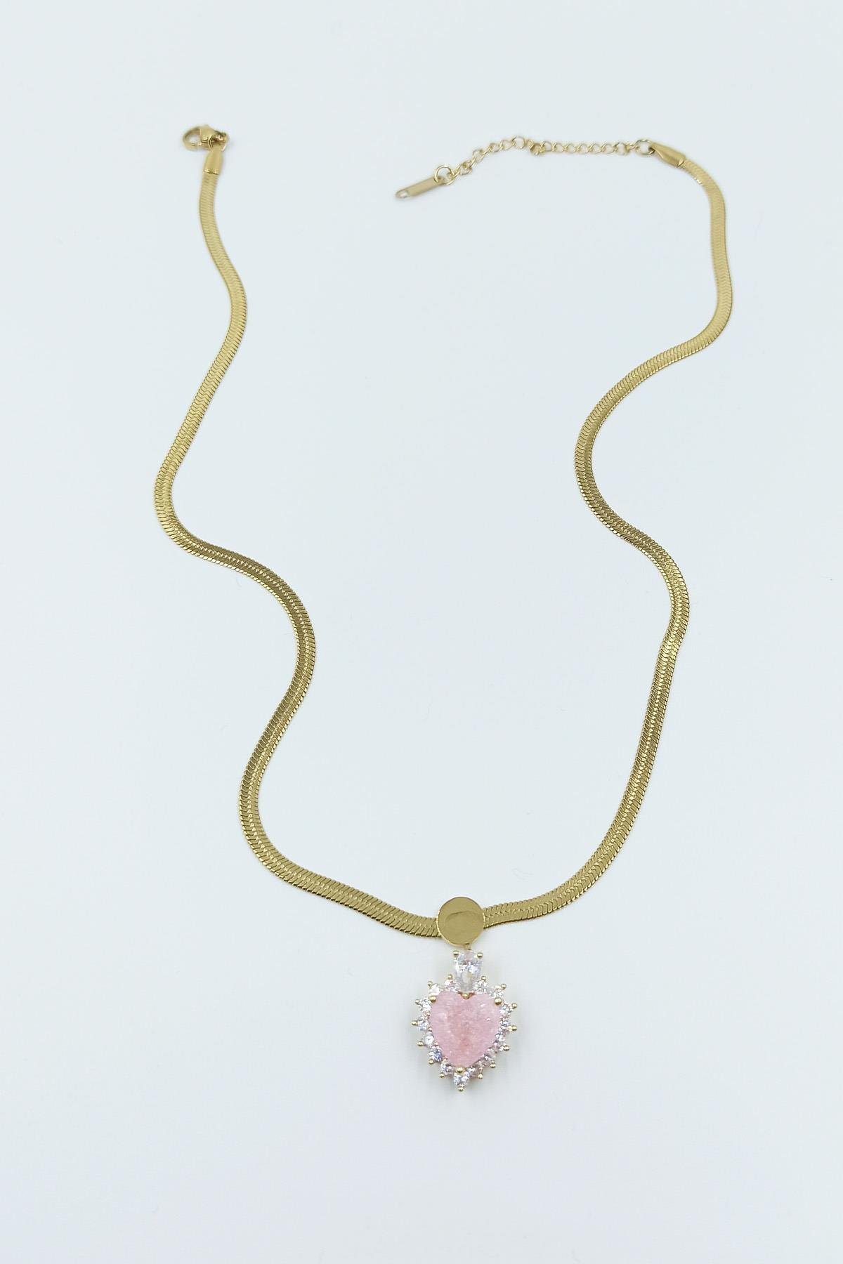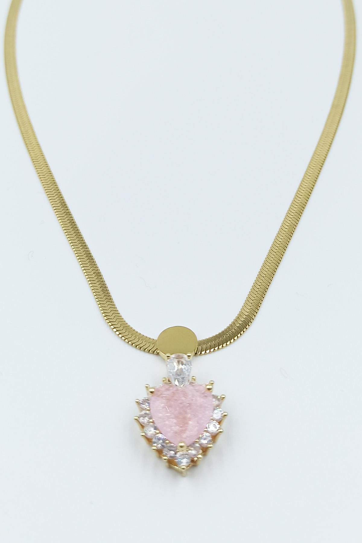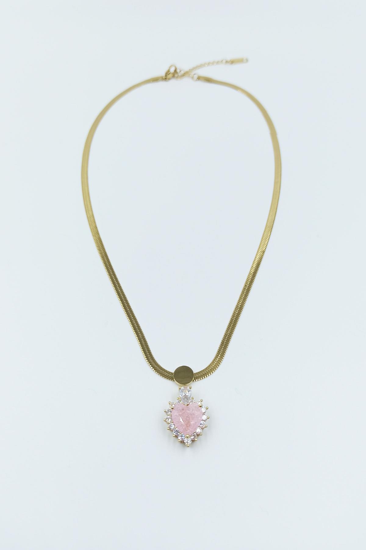 Altın Kaplama Pembe Kalp Detaylı Baget Taşlı İtalyan Zincir Çelik Kolye