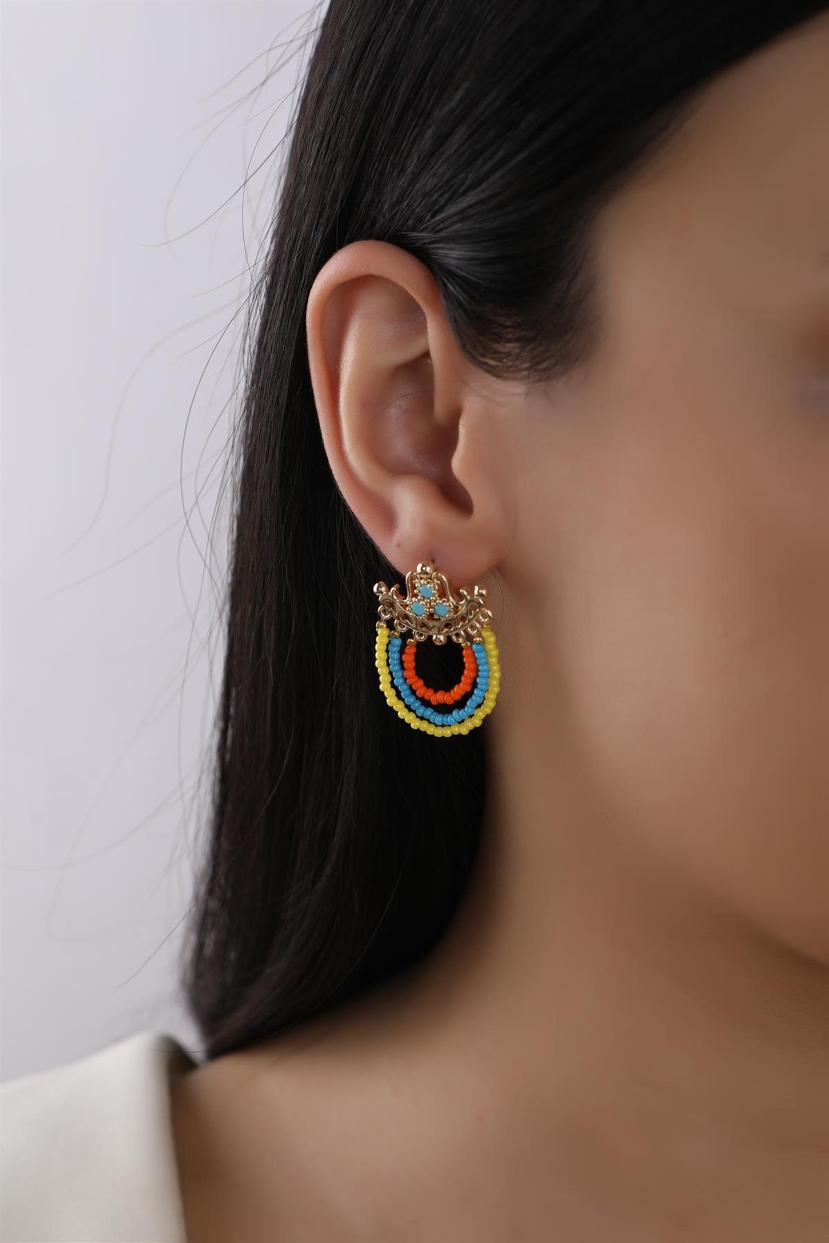 Altın Kaplama Sarı Mavi Turuncu Boncuklu Küpe
